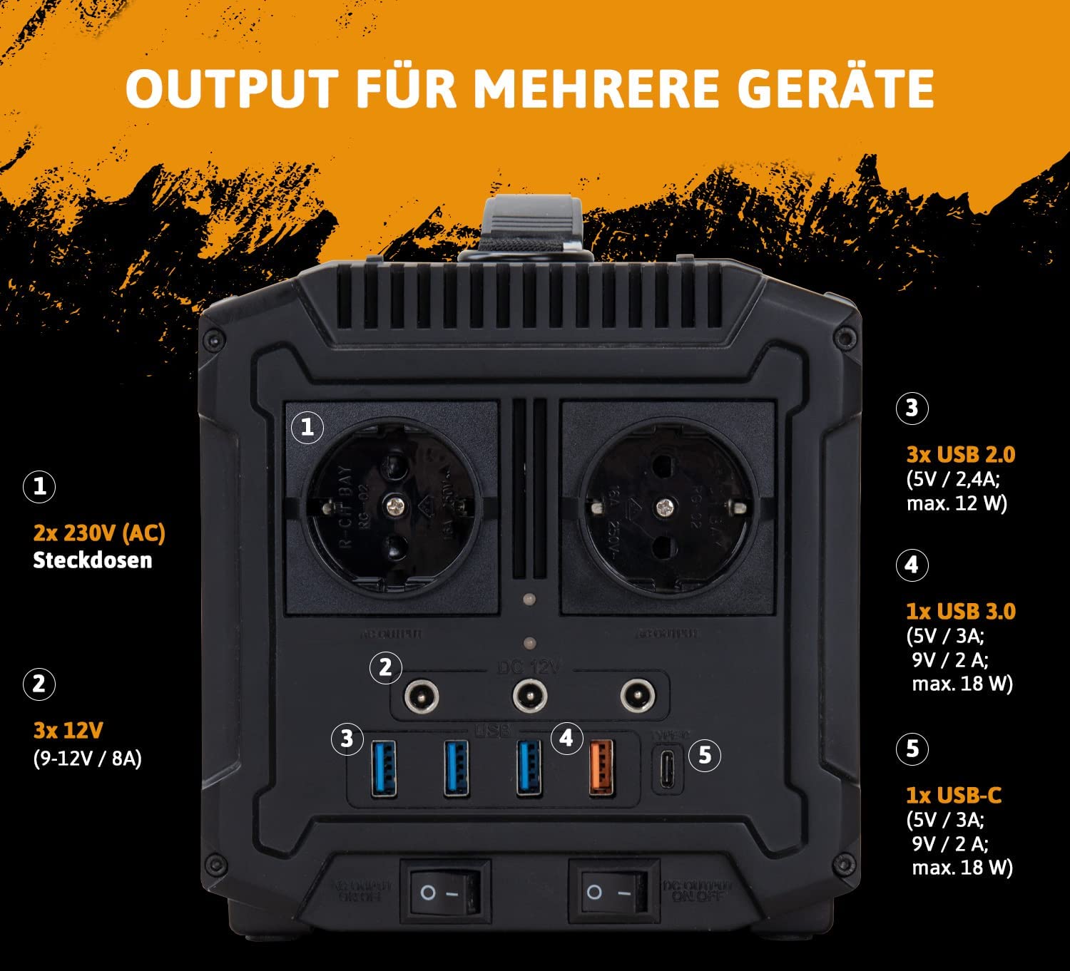 | Steckdosen: | 2x230V / 1xUSB-C / 4x 12V / 3x USB 2.0 / 1xUSB 3.0 |