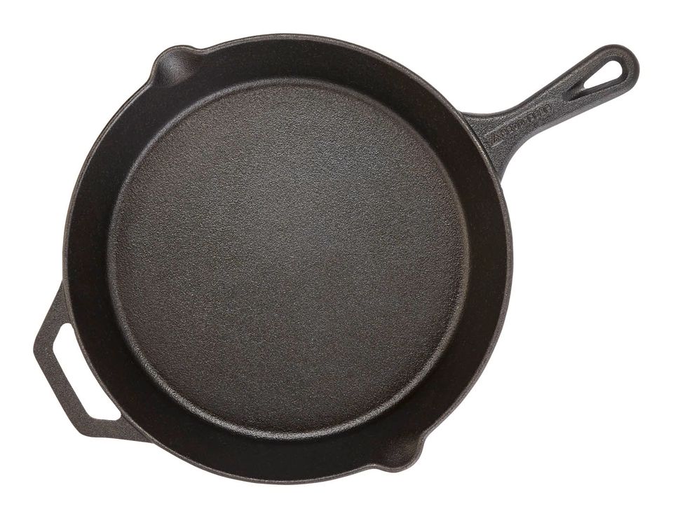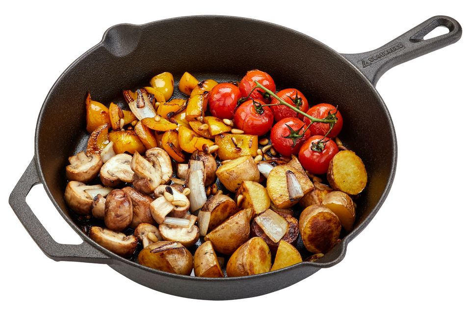 Gusseiserne Pfanne für leckeres Braten und Schmoren. Die gleichmäßige Wärmeverteilung sorgt für optimale Ergebnisse – auch ohne Grill, direkt über dem Feuer. Kurzgebratenes wird außen knusprig und bleibt innen saftig, Gemüse bleibt knackig und behält seine Nährstoffe und Bratkartoffeln werden kross und schmackhaft. Mit den praktischen Ausgüssen an beiden Seiten lassen sich Flüssigkeiten und Soßen ganz einfach und genau dosiert abgießen. Geeignet für Grill, Gasherd, Backofen oder offenes Feuer.