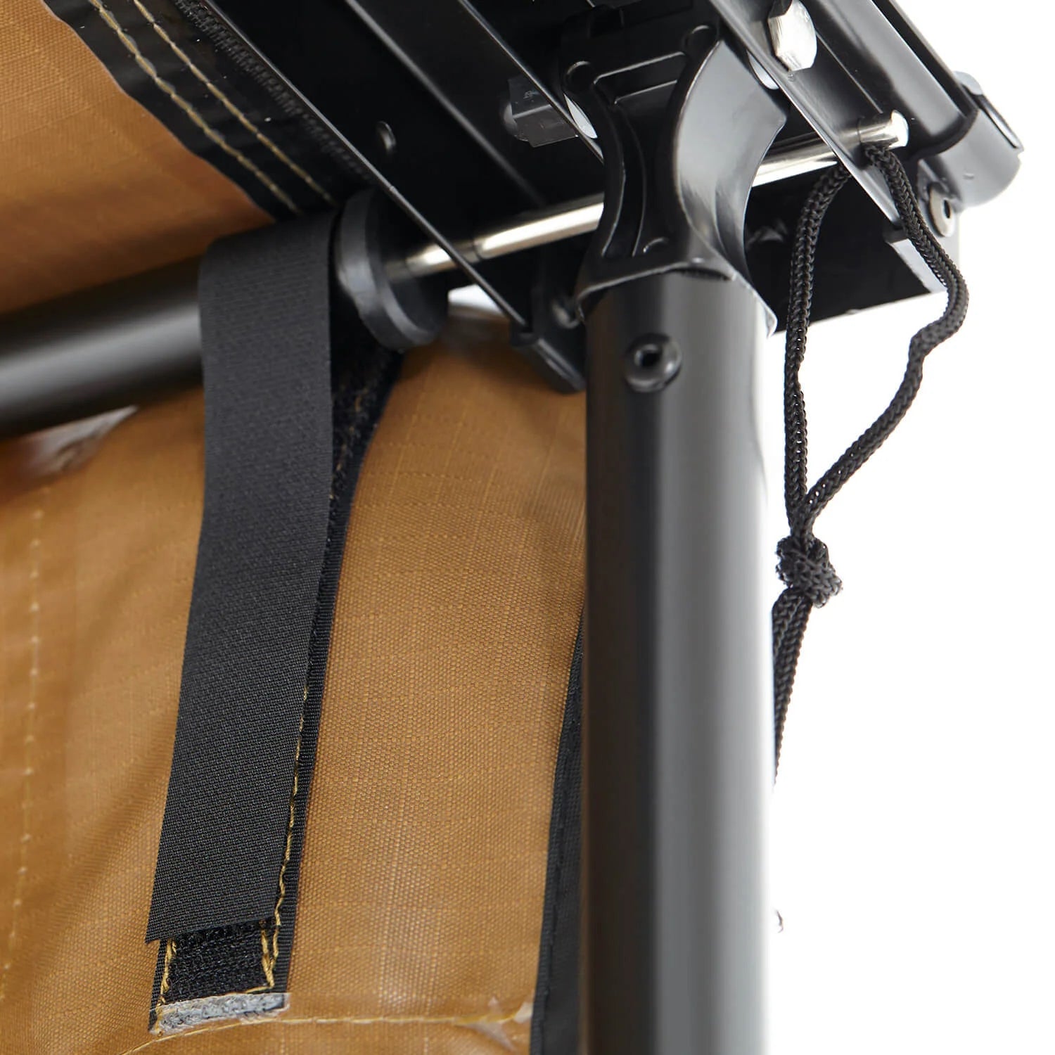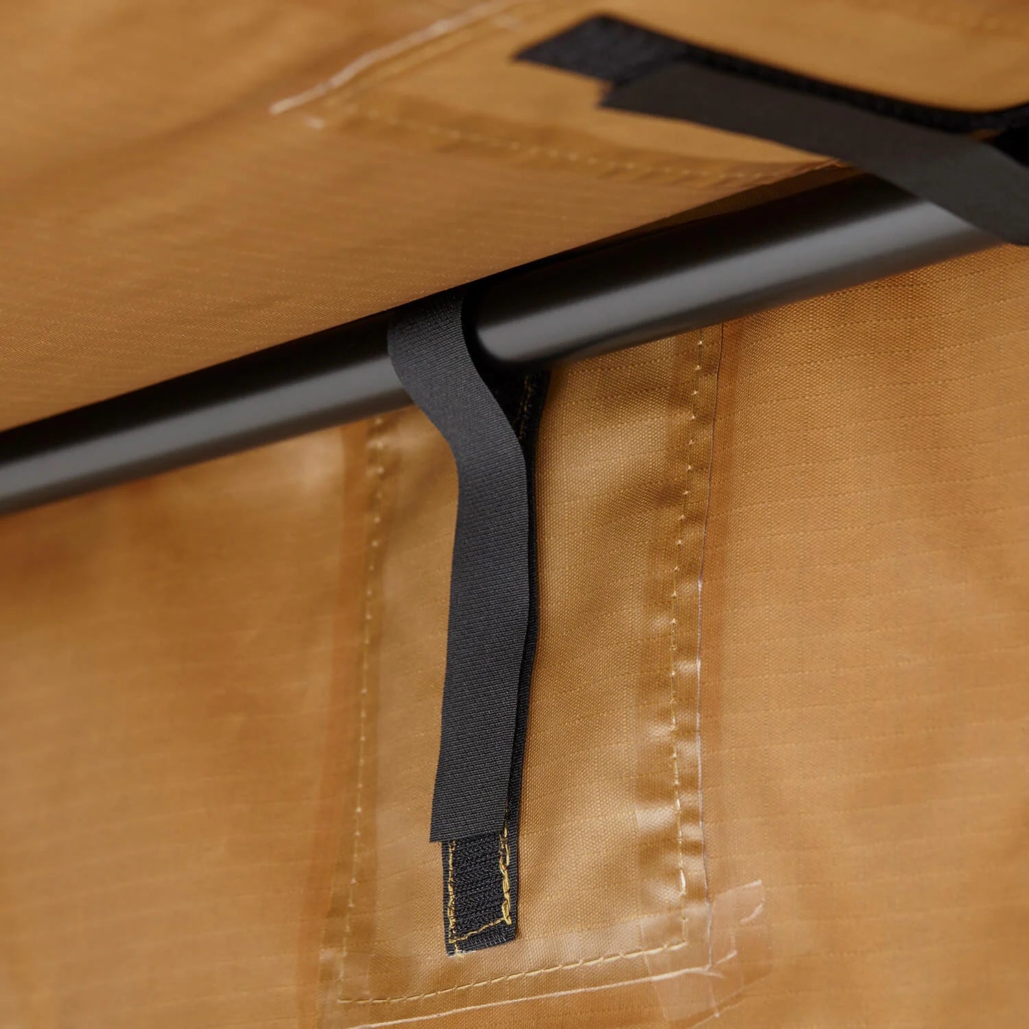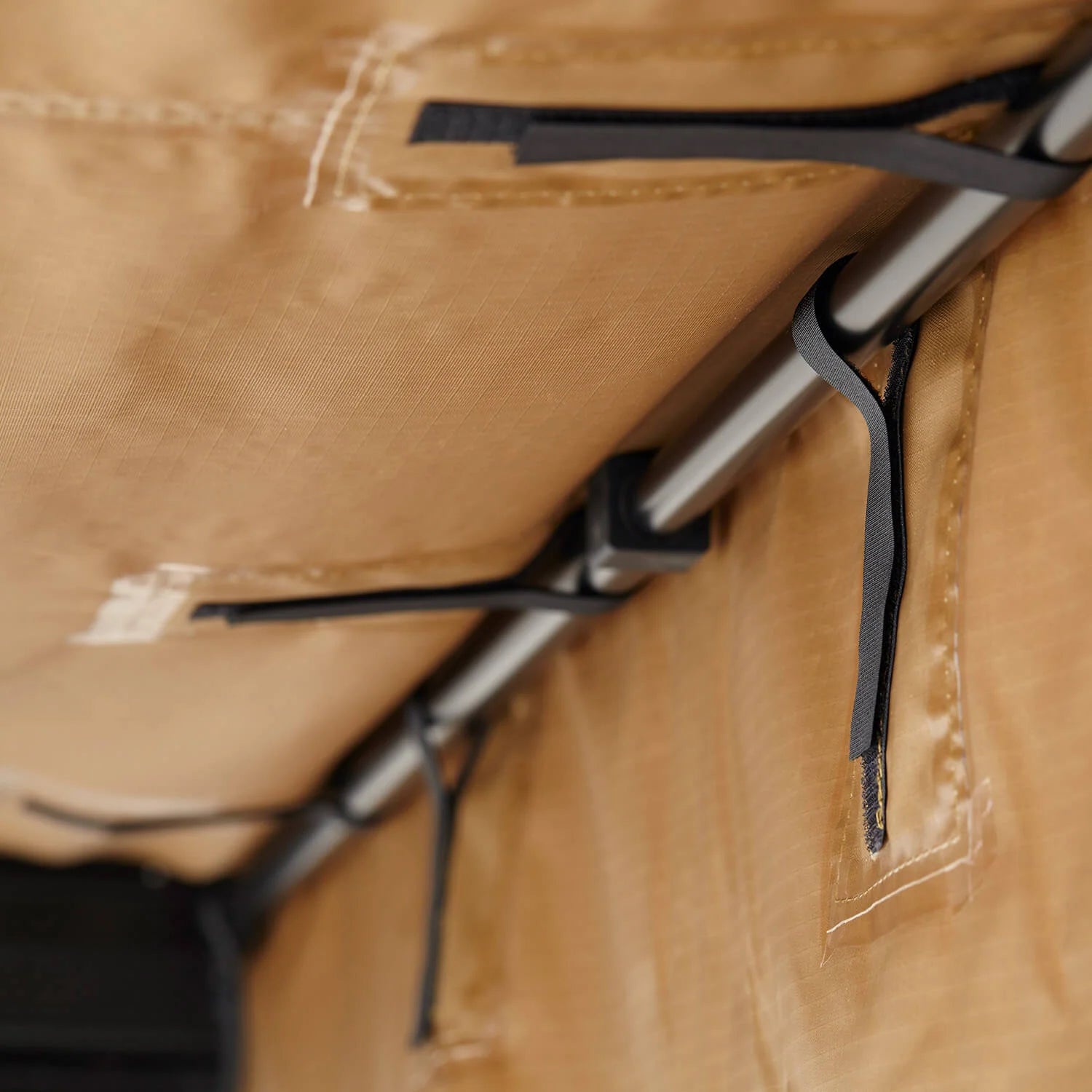 Hergestellt aus recyceltem 320 g/m² Ripstop-Polyester mit PU-Beschichtung (5.000 mm Wassersäule), bietet die Einzelwand den gleichen Schutz wie hochwertiger Markisenstoff. Die Farben schwarz oder braun sorgen für eine elegante Optik und passt zu nahezu jedem Fahrzeugdesign.